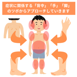 当院では患部だけでなく、症状と関連が深く効果的な「手」「脚」「背中」などにあるツボからもアプローチしていきます。